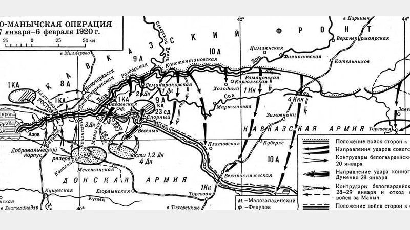 17 января 1920 г. началась Доно-Манычская операция красных. В ходе нее им удалось занять междуречье Дона и Маныча со станицей Великокняжеской (ныне Пролетарск), но не левый берег Маныча.