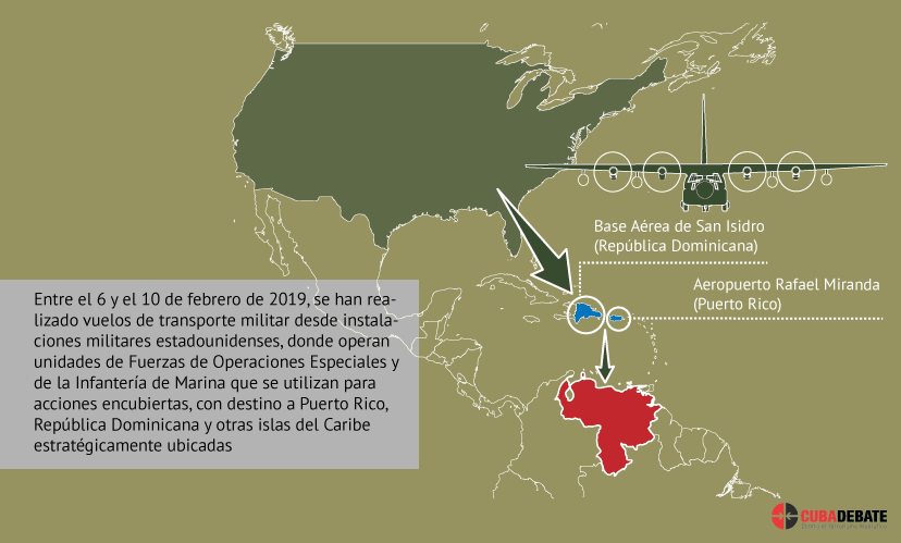 Но военная мобилизация в Карибском регионе гораздо шире. В кубинском заявлении разъяснялось, что с 6 по 10 февраля 2019 г. совершались полеты военно-транспортных самолетов в аэропорт «Рафаэль Миранда» на Пуэрто-Рико, на базу ВВС Сан-Исидро в Доминиканской Республике и на другие карибские острова, занимающие важное стратегическое положение.