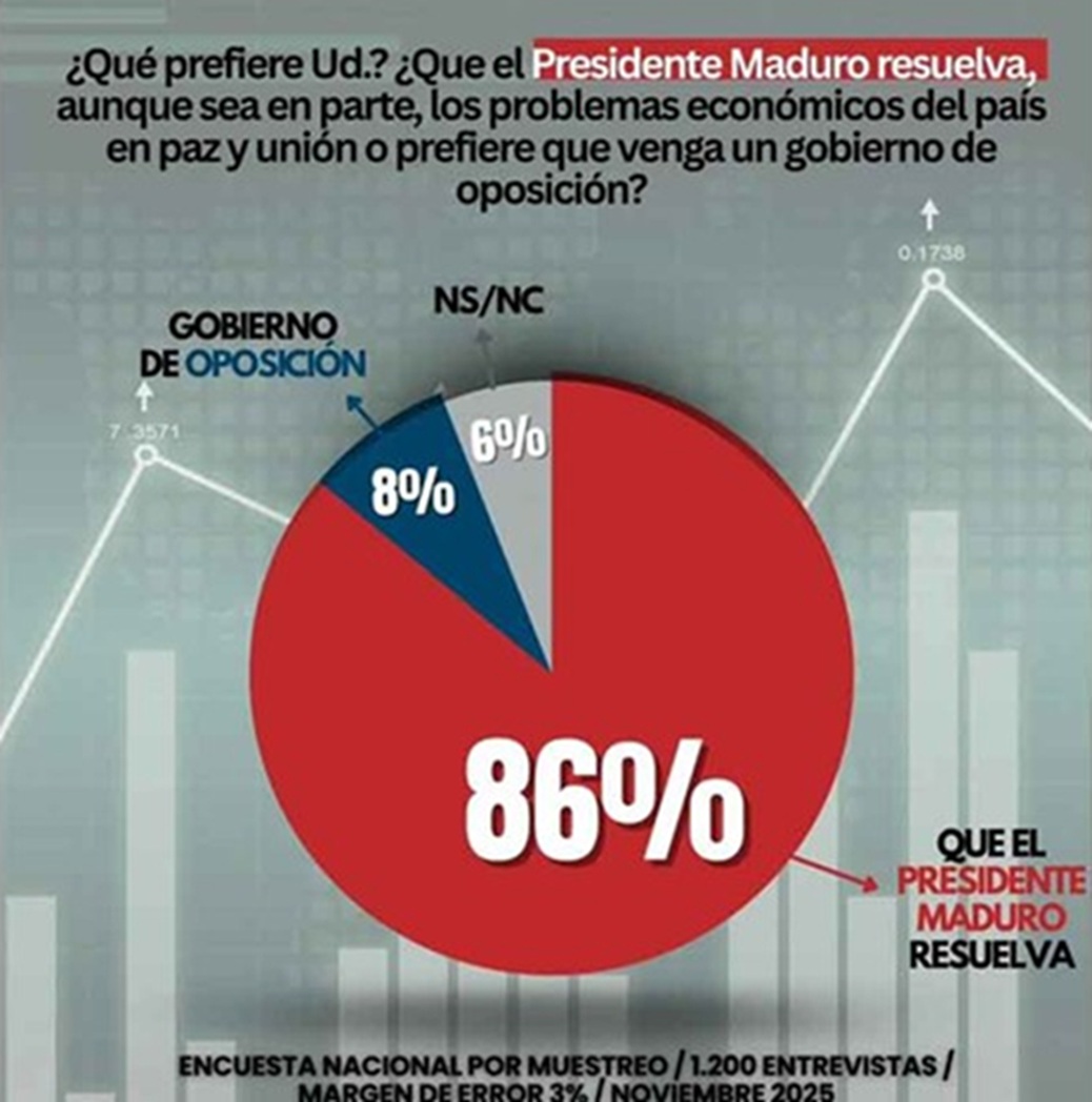 Николас Мадуро с полным основанием отмечает, что 16 недель осады сплотили венесуэльский народ как никогда прежде. По итогам опроса 19 ноября, на вопрос: «Кого Вы считаете гарантией мира и спокойствия?» 90% ответили «президента Николаса Мадуро» и лишь 6% – «правительство оппозиции». Отвечая на вопрос, кому доверить решение экономических проблем, 86% предпочли президента и 8% - оппозицию.