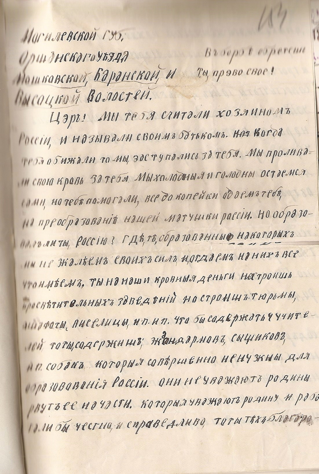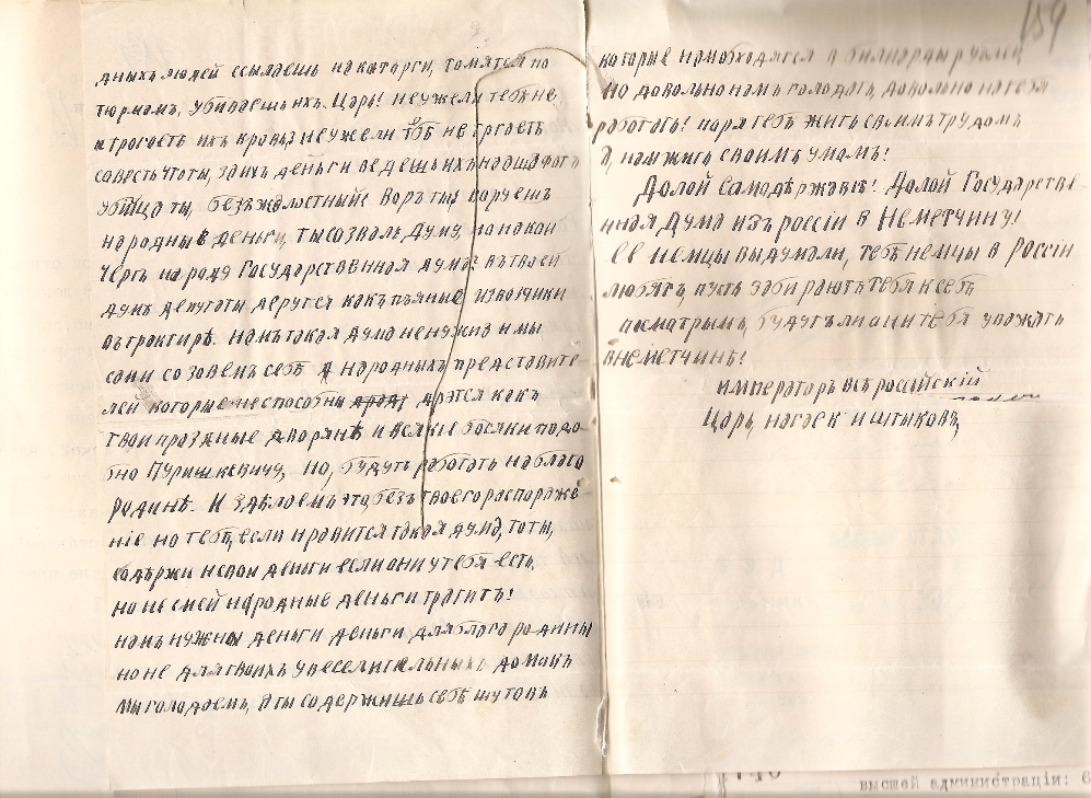 Царь! Мы тебя считали хозяином России, и называли своим бытьком. Когда тебя обижали, то мы заступались за тебя. Мы проливали свою кровь за тебя. Мы холодные и голодны[е] остаемся сами, но тебе помогали, все до копейки отдаем тебе, на преобразование нашей матушки России. Но образовал ли ты Россию? Где те образованные, на которых мы не жалеем своих сил и отдаем на них все, что имеем? Ты на наши кровные деньги не строишь просветительных заведений, но строишь тюрьмы, эшафоты, виселицы и пр., и пр. Чтобы содержать учителей, то ты содержишь жандармов, сыщиков, и п[рочих] собак, которые совершенно не нужны для образования России. Они не уважают родины, рвут ее на части. Которые уважают родину, и работали бы честно и справедливо, то ты тех благородных людей ссылаешь на каторги, томятся по тюрьмам, убиваешь их, Царь! Неужели тебя не трогает их кровь? Неужели тебя не трогает совесть, что ты за их деньги ведешь их на эшафот? Убийца ты безжалостный, вор ты, воруешь народные деньги; ты созвал думу, но на кой черт народу Государственная дума? В твоей думе депутаты дерутся, как пьяные извозчики в трактире. Нам такая дума не нужна, и мы сами созовем себе народных представителей, которые неспособны драться, как твои праздные дворяне и всякие босяки, подобно Пуришкевичу, но будут работать на благо родины. И сделаем это без твоего распоряжения, но тебе, если нравится такая дума, то ты содержи н[а] свои деньги, если они у тебя есть, но не смей народные деньги тратить!