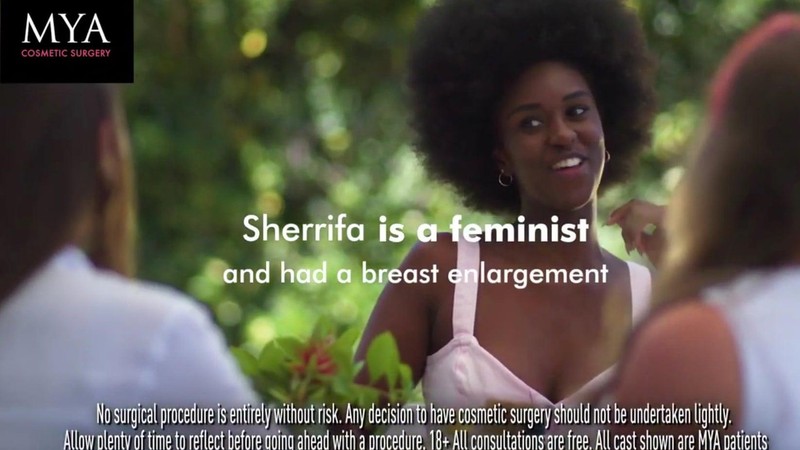 Последняя реклама MYA под названием «Любое тело», получила бы все очки в бинго «Реклама, нацеленная на женщин в 2019 году». Вот настоящая женщина, делающая первые шаги в фитнесе: тежелоатлетка, сосредоточенная на том, чтобы стать сильной, а не худой. Вот архетипическая молодая женщина, покрытая татуировками, с волосами цвета сахарной ваты. И, конечно же, обязательно представительница этнических меньшинств. Все они страдают от неуверенности в себе, и MYA предлагает хирургическое решение. А настоящий козырь — «Шеррифа, феминистка, которая увеличила себе грудь (вы можете и то, и другое)». Такое ощущение, что MYA хочет сделать еще и политический повод.